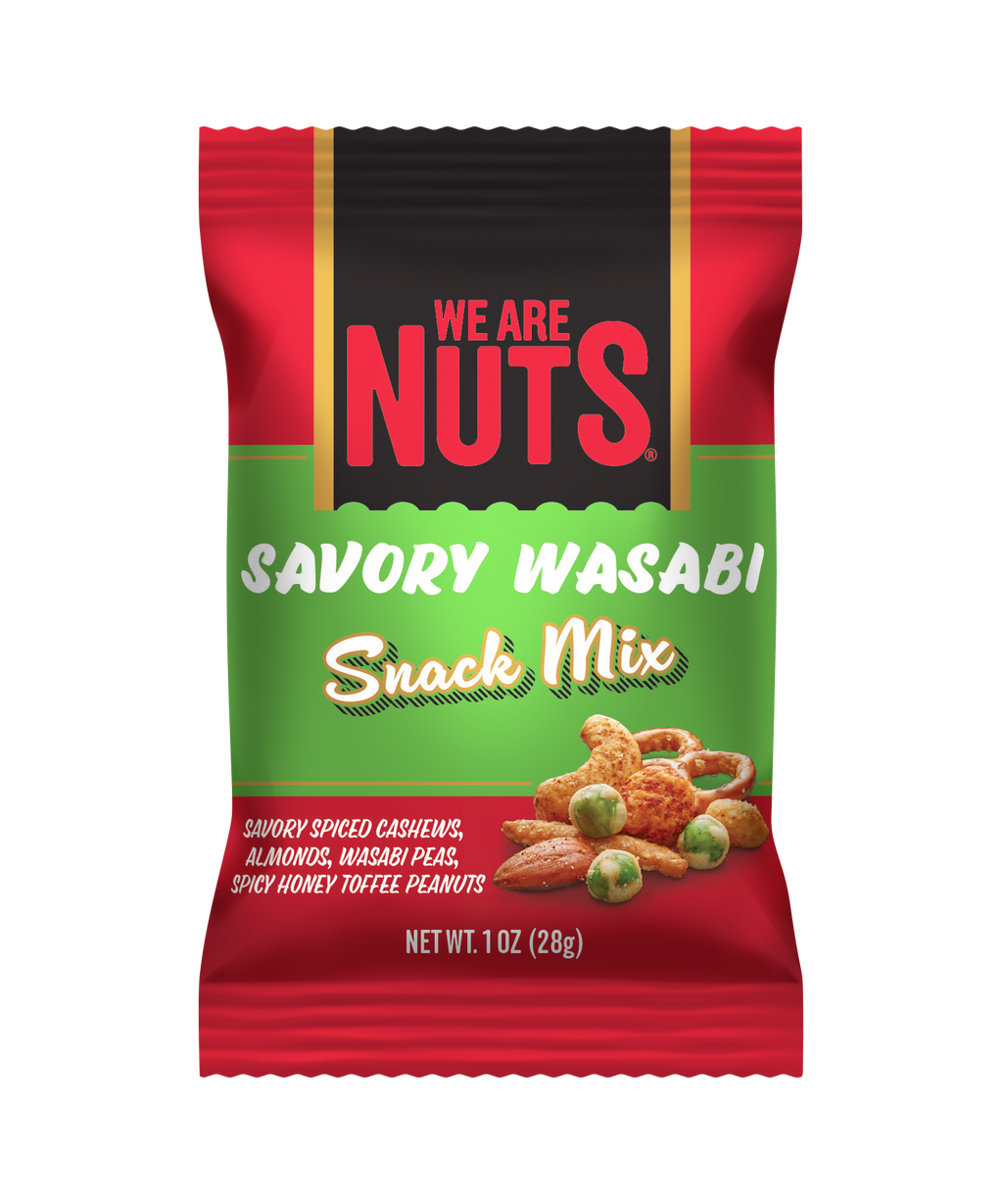 Dive into a zesty snacking experience with our Savory Wasabi Snack Mix! This 1 oz blend starts with spicy honey toffee peanuts, savory spiced cashews, and almonds, perfectly complemented by the crunch of wasabi peas. Adding to the mix are mini twist pretzels, sesame sticks, and honey roasted sesame sticks, creating a dynamic medley of bold flavors and textures.