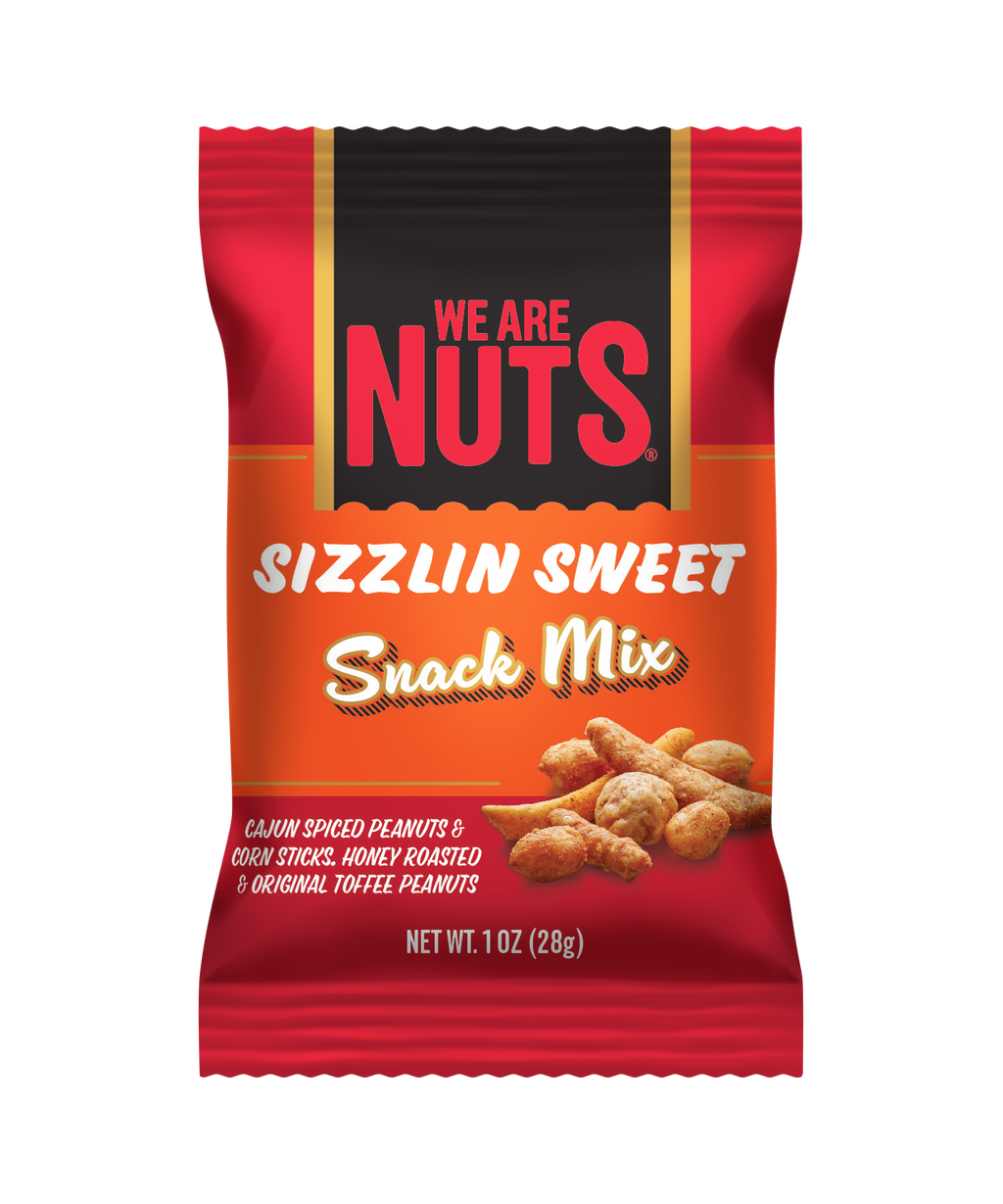 Get ready for a fiery-sweet adventure with our Sizzlin' Sweet Snack Mix! This 1 oz blend features Our Original Toffee Peanuts, honey roasted peanuts, and Cajun blanched peanuts, followed by a spicy and sweet medley of spicy sesame sticks, honey roasted sesame sticks, and hot Cajun corn sticks. The result? A mouthwatering mix of bold heat and sweet indulgence in every bite.
